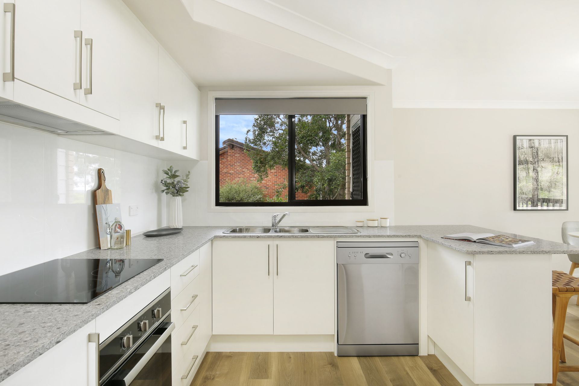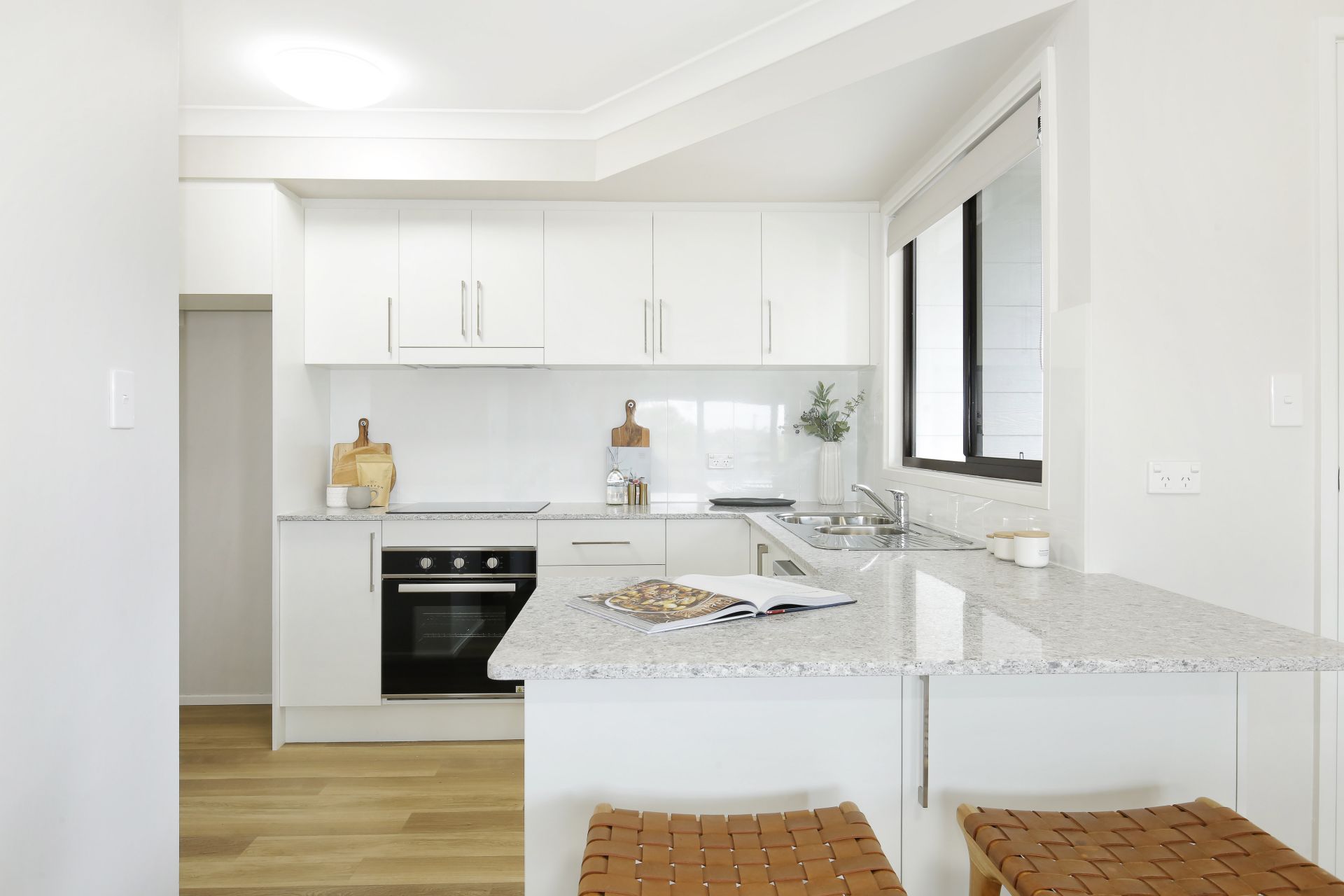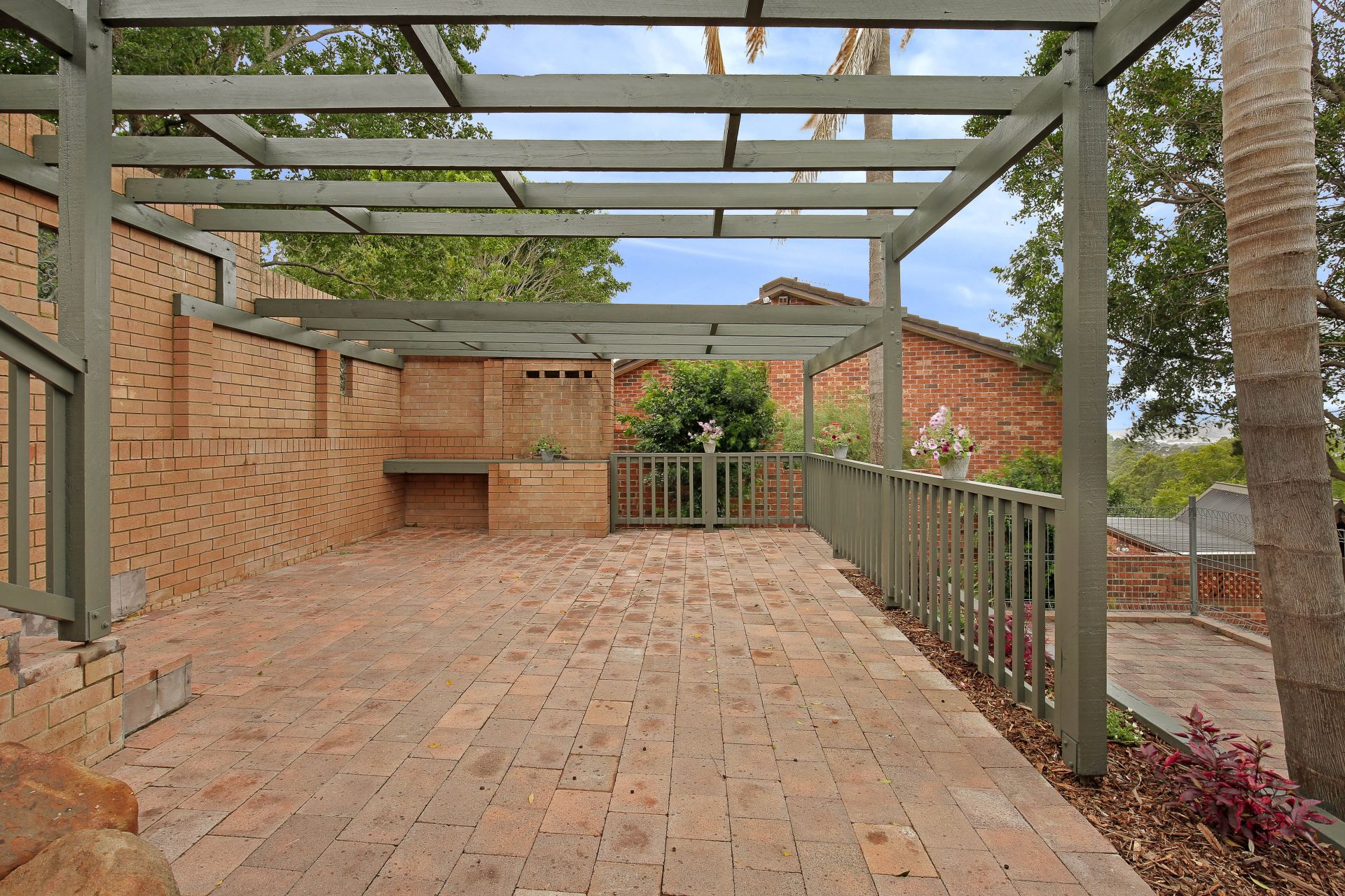 Brand new stylishly appointed kitchen waiting for the chef to whip up dinner. Outside is a private alfresco dining and barbecue area with pergola.