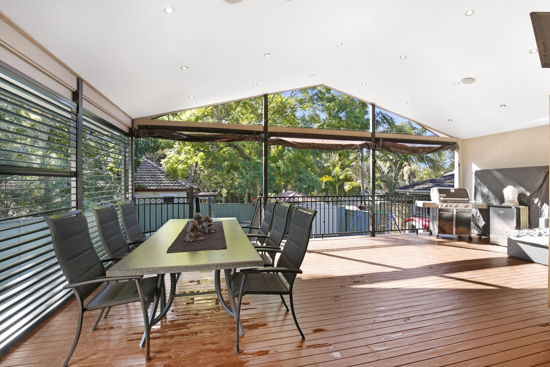 With louvres and cafe blinds to protect it from the elements the deck becomes a huge entertainment area, and already set to add the telly - imagine finals night!